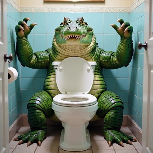 Un coccodrillo con il corpo da water con le braccia e i piedi giganti