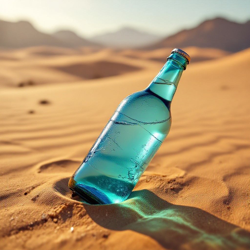 Bottiglia nel deserto aperta che sta perdendo acqua