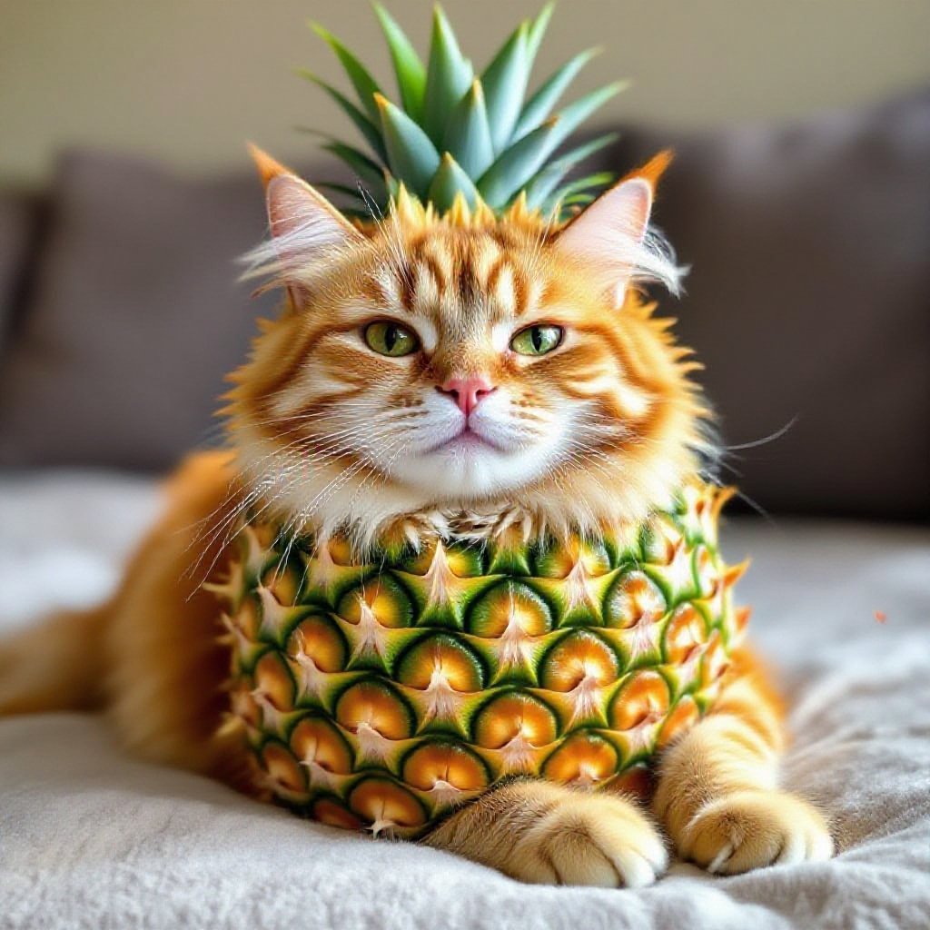 A cat that is half pineapple half cat and she loves and coffee. She loves attention and lovings
