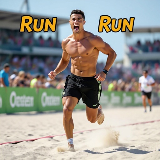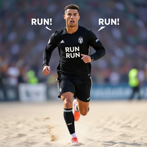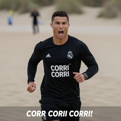 Cristiano Ronaldo che corre sulla sabbia e dice corri corri corri