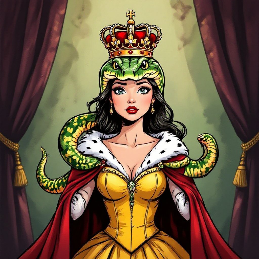 An anaconda putting on a queen female skin suit but gets it on successfully and wears a crown and royal dress but struggles to get on the human female face part of the skin suit