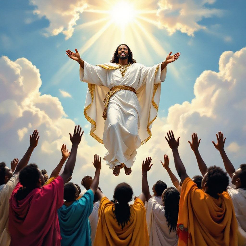 Congo Gorilla Christ ascends to heaven, welcomed by people all over the universe