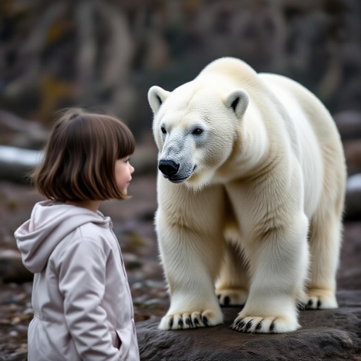 Una bambina col caschetto che a vicino un orso polare