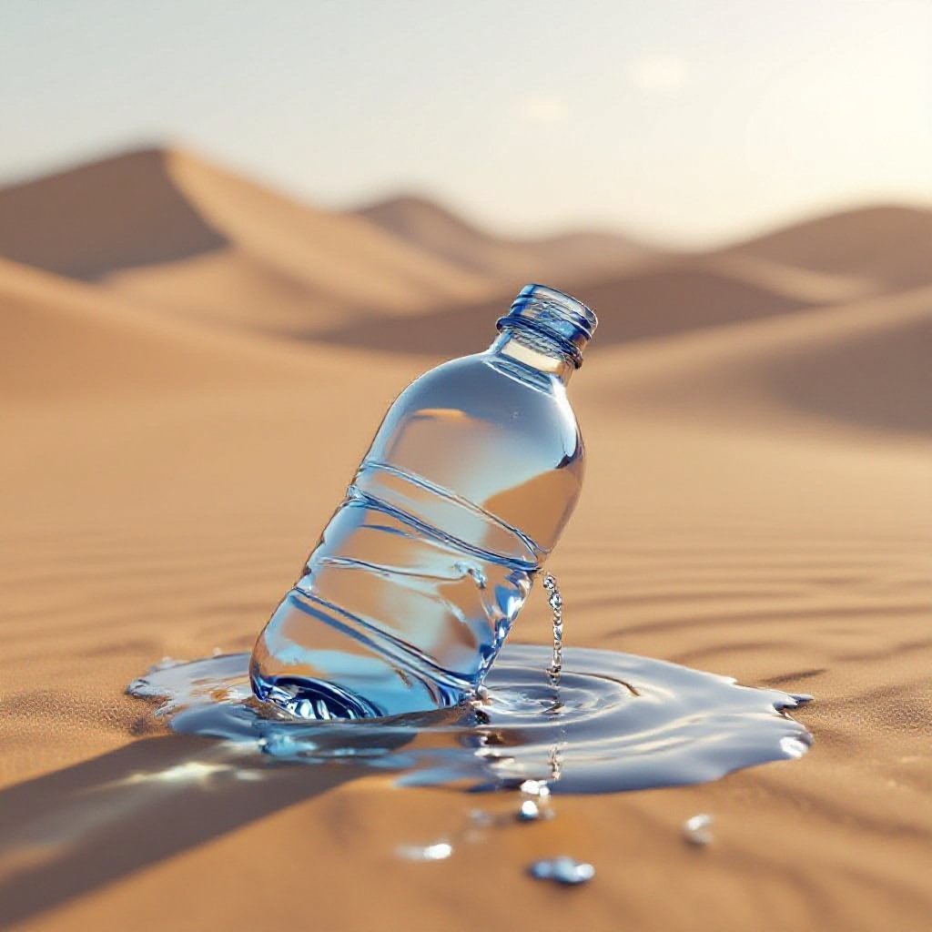 Bottiglia nel deserto aperta che sta perdendo acqua