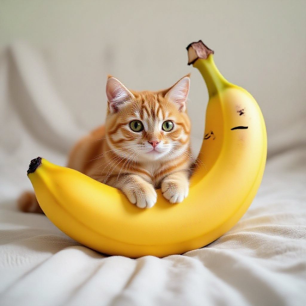 Un gatto con un lancia razzi con un vestito blue e un banana