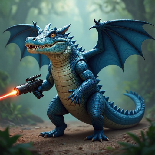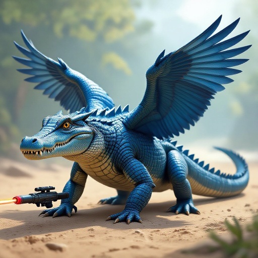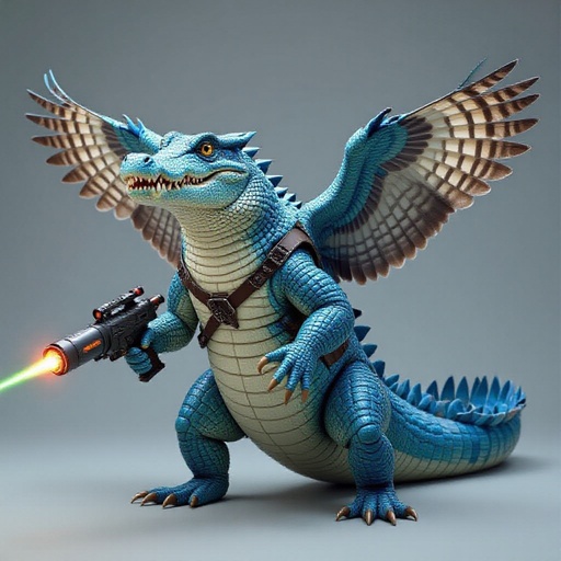 Un coccodrillo blu con le ali da gufo e i canoni laser