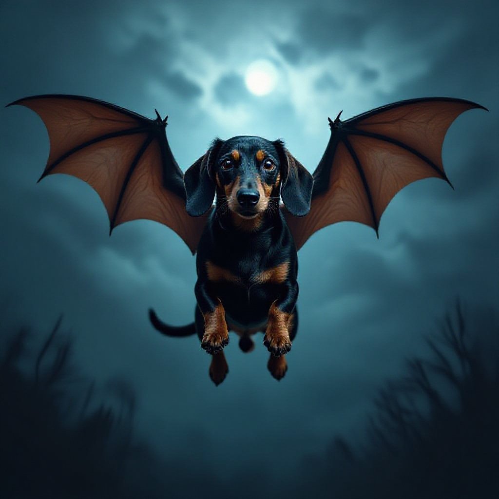Dachshund con ali da pipistrello che vola