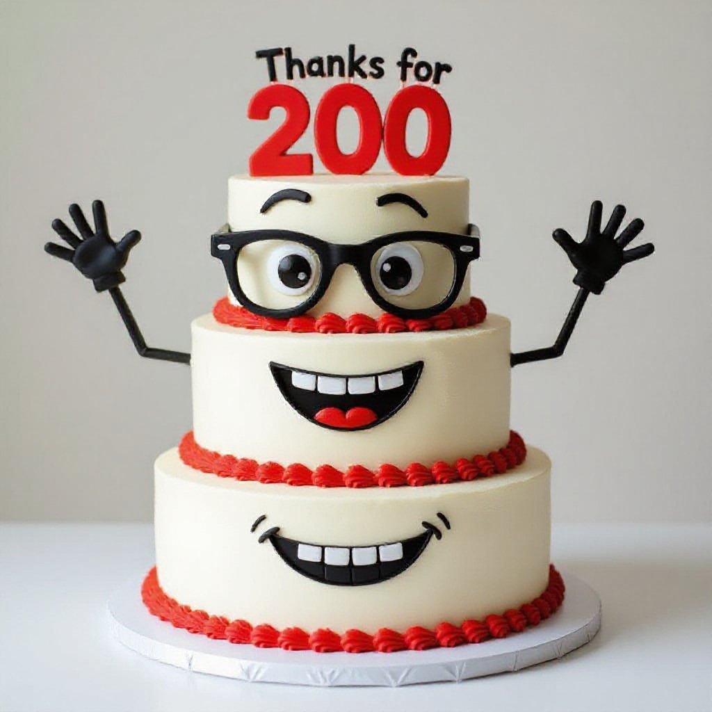 Thanks for 200 followers (3 cake stack with a face legs and arms and wearing gangster glasses)