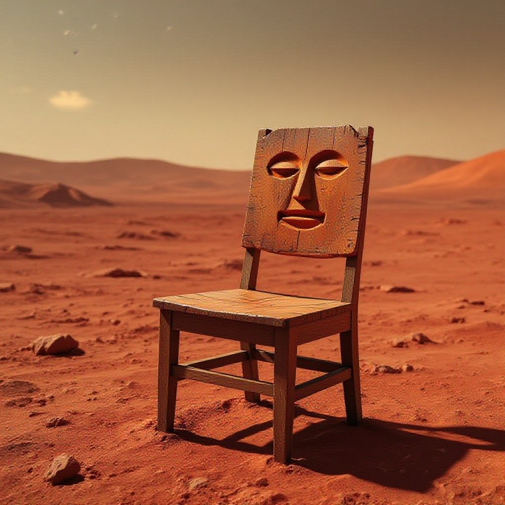 Cyan chair 2 cyan leg 2 cyan hand human face in desert