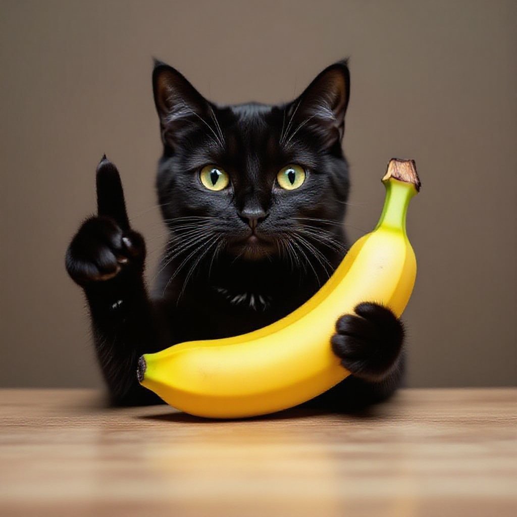 Un gatto con un lancia razzi con un vestito blue e un banana