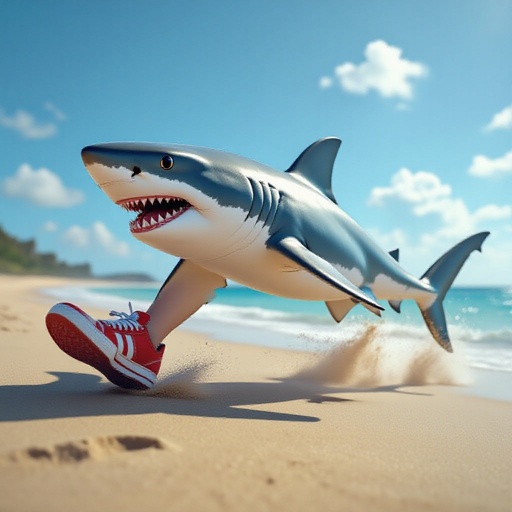 Uno squalo che corre con le scarpe di sonic nella sabbia molto realistico
