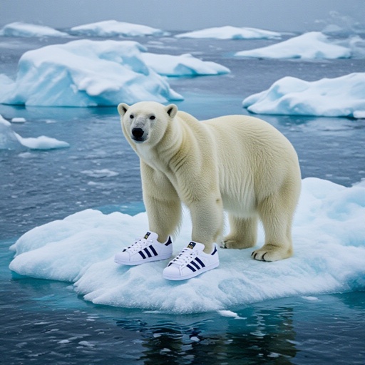 Un orso polare sul ghiaccio che indossa le scarpe Adidas