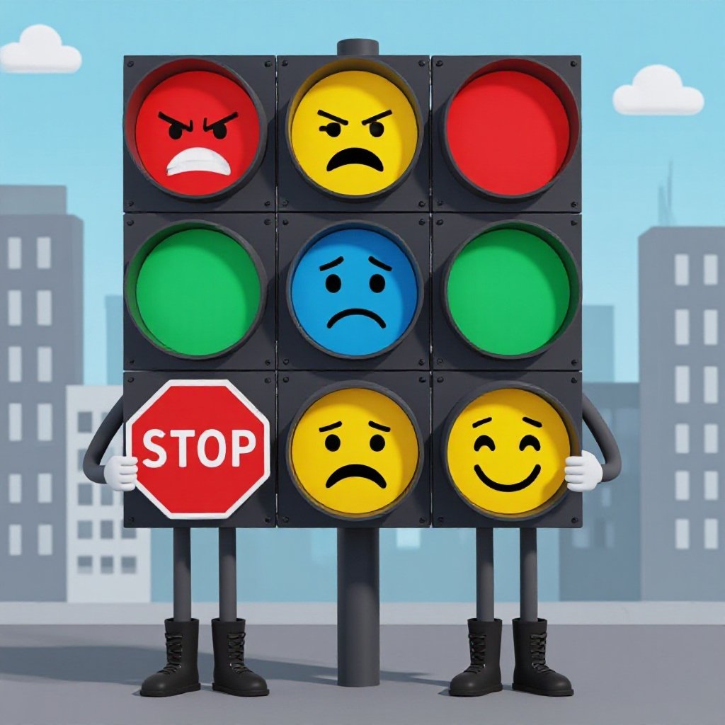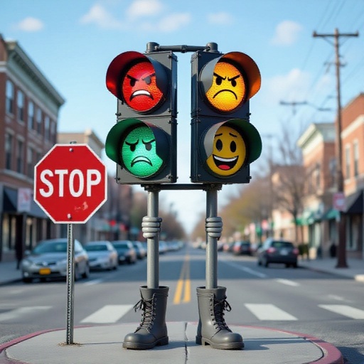 Traffic light with 3 human face angry and sad and happy 2 grey arm 2 grey leg with wear 2 boots with stop sigh in city