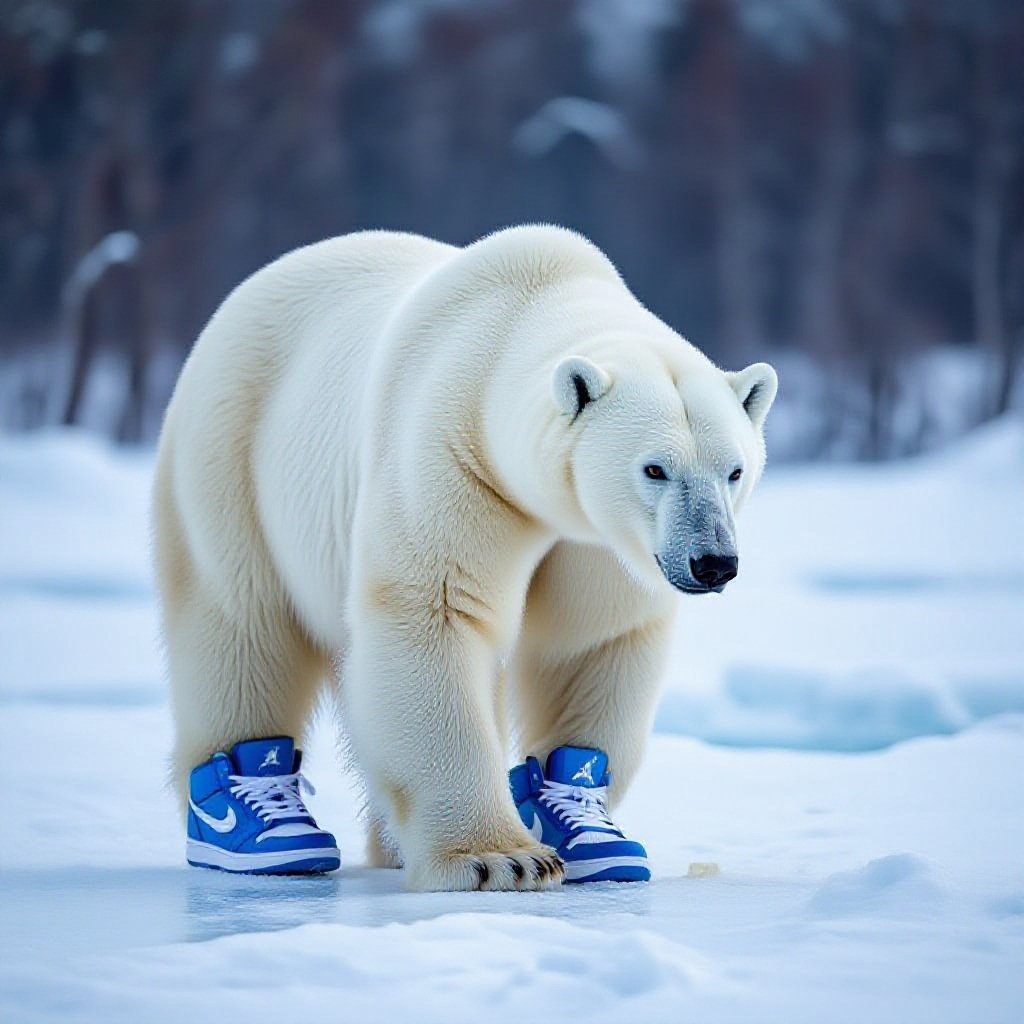 Un orso polare sul ghiaccio con le scarpe Jordan azzurre