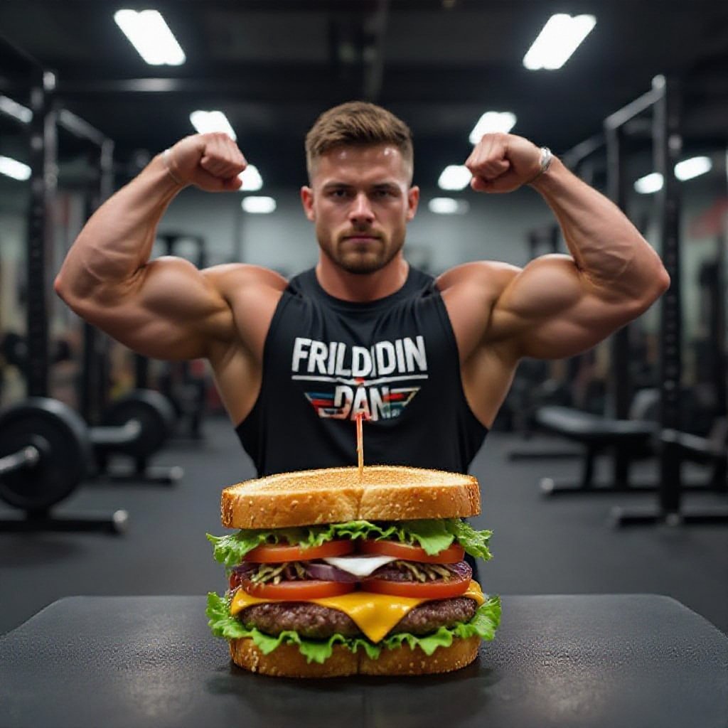 Frildididin Dan don (sandwich with muscular arms and legs in a gym)