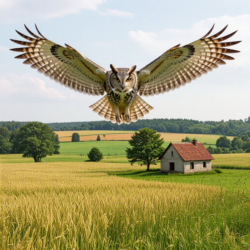Kapi Ingas Behandrin La Kahla Aufkus (Owl fused with man in a countryside)