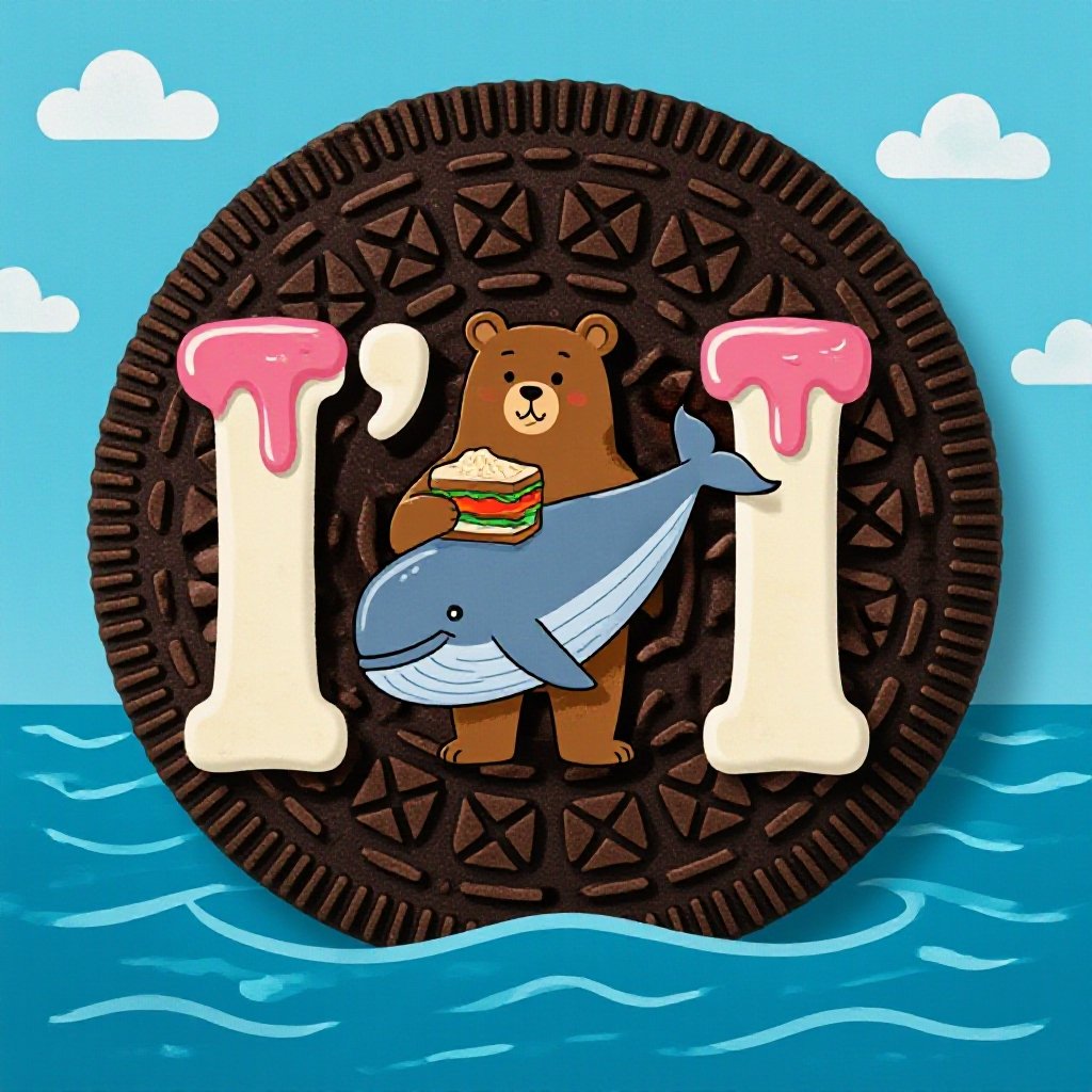 Un Oreo marrone seduto la fuori Dimitri una scritta mobidick sulla prima I metti una balena in piedi con un panino in Mano e dove mangia l orso metti la salsa Rosa