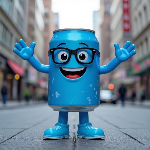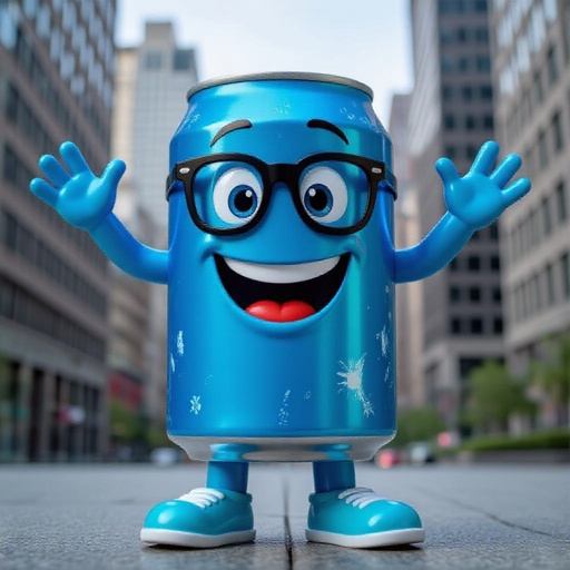 Blue soda can with human face 2 blue arm 2 blue leg with smile wear glasses and wear 2 cyan shoes in city