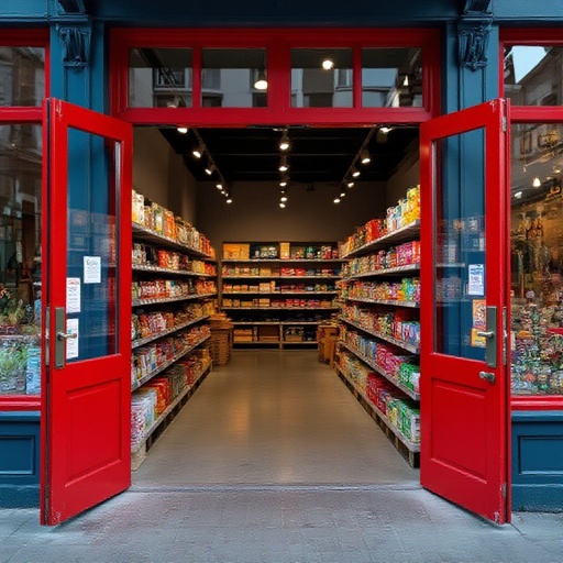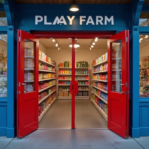 Open red door with space grocery store open blue door with playfarm