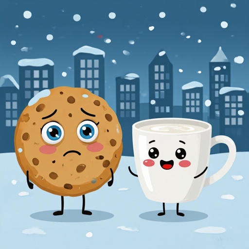 Cookie with sad human face 2 human leg and cup milk with happy human face 2 human leg in city with snow