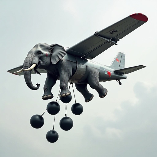 Un elefante con un corpo da aereo che tira bombe