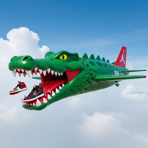 Un aereo che ha la faccia di un coccodrillo che lancia scarpe Jordan
