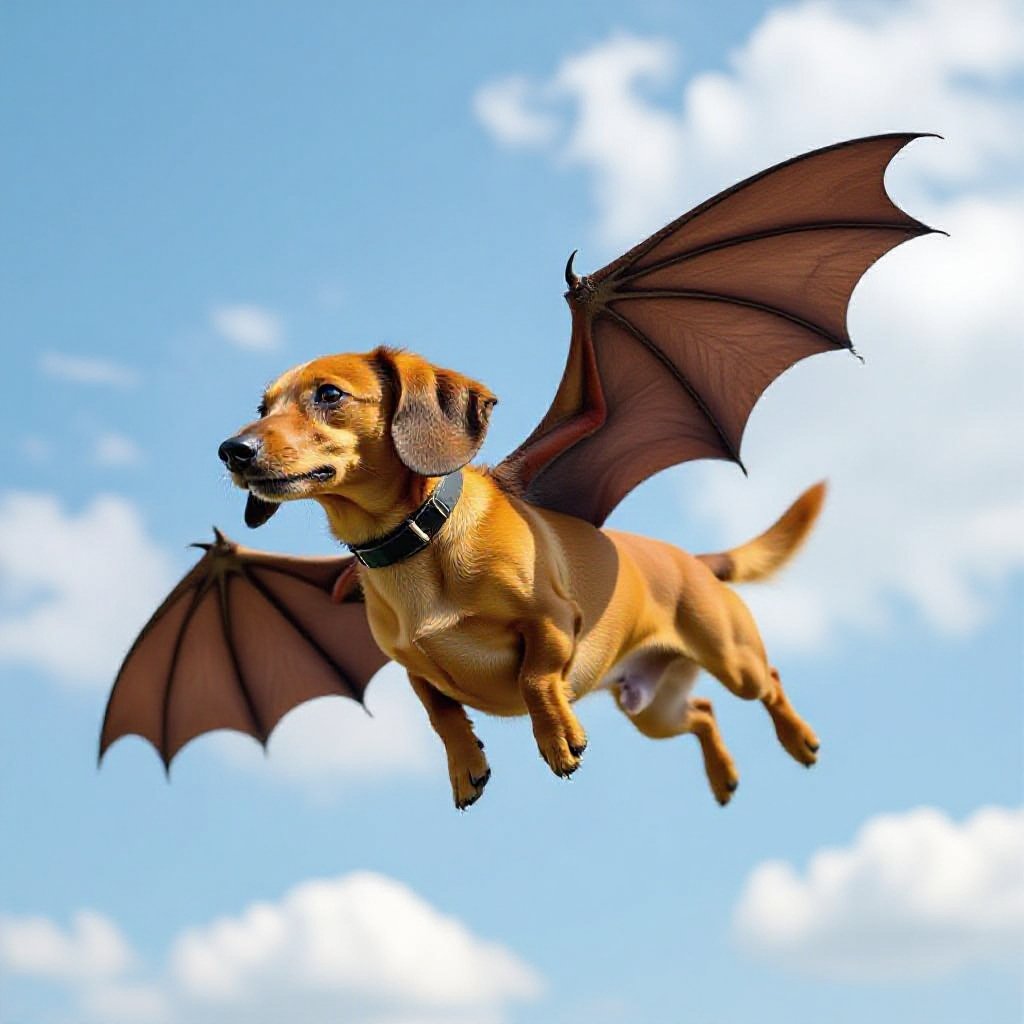 Dachshund con pelo giallo e con ali da pipistrello che vola