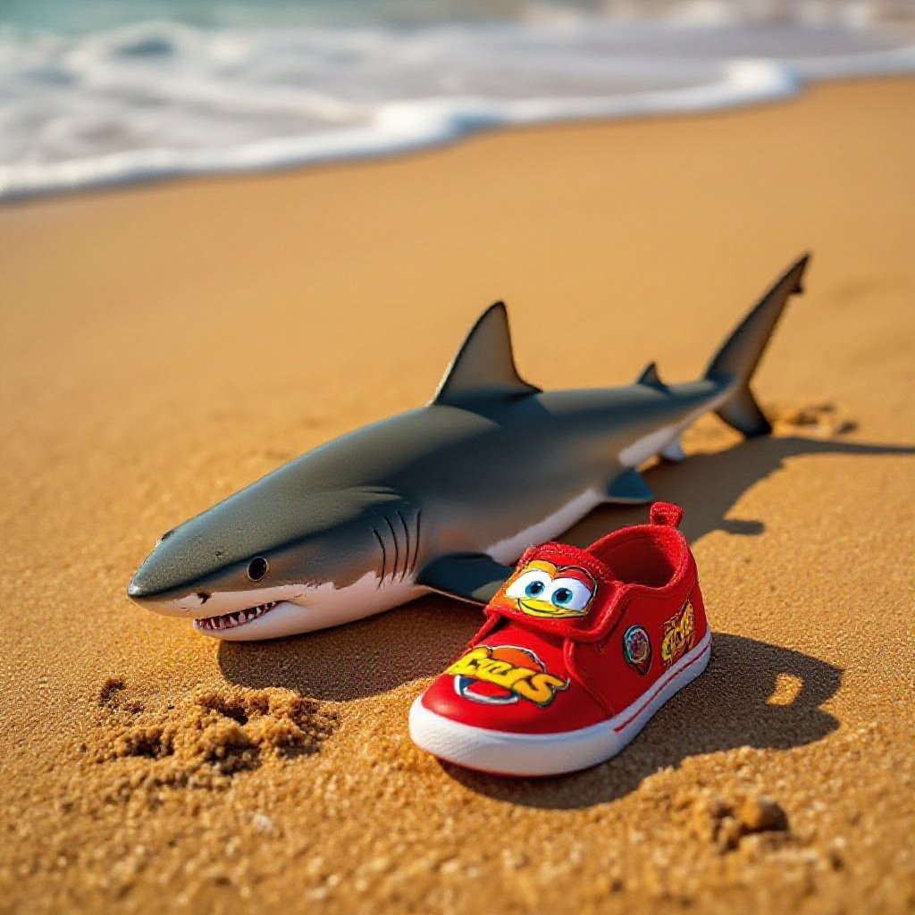 Uno squalo piccolo sulla sabbia con le scarpe di cars