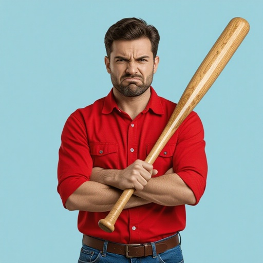 Un uomo con le braccia incrociate arrabbiato con una mazza fatto di legno