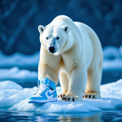 Un orso polare sul ghiaccio con le scarpe Jordan azzurre