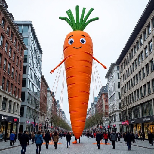 Kre kre kre kre kre sahur (Carrot with puppet strings standing 20m tall in a city with people)