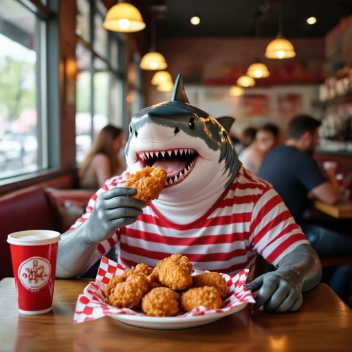 Uno squalo Che mangia pollo fritto con la salsa Rosa raising Kane in in locale con Tanta gente pero seduto